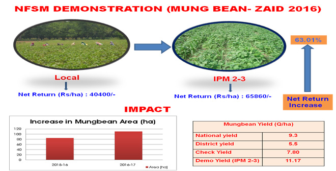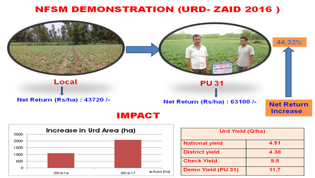 The KVK conducted more than 200 CFLD under pulses with latest varieties of Mung & Urd. The scientific cultivation at farmers field resulted in better economic result which motivated the farmers to grow more pulses. The impact of demonstration on economics and expansion in area is as under .