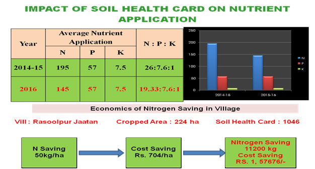 Site specific nutrient management and fertilizer recommendation mission were completed at Muzaffarnagar District. Where Problems of depletion of Soil healthdegradation due to Sugarcane-wheat cropping system and also observed average nutrient application used ratio N:P:K (195.5:57.8:7.5 kg/ha) i. e N:P:K (26:7.7:1). KVK initiative as 89 Soil samples analyzed during 2014-15and total 1046 soil samples collected and analyzed during 2015-16. It was observed pH is slightly above the normal range i.e. 7.6, E.C- 0.13, organic carbon 0.45 %, available Phosphorus 12.7 kg/ha, available potash 116 kg/ha, available Sulphur 2.62, Zinc 0.92 and Boron 0.06 ppm which is on lower side. Soil health cards and awareness campaign through 16 training programmes, 270 demonstrations, and 15 Field days. The main crop of sugarcane were planted in month of February and harvested after one year. Fertilizer applied per acre as 150 kg NPK (12:32:16), MOP 30 kg, zinc sulphate 10 kg (21%) , sulphur granular 20 kg (90%), ferrous sulphate 15 kg (15%), boron 2 kg (15%) per acre near to root zone as basal dose and 125 kg urea applied through three split doses after irrigate the fields. MOP 40 kg, mono zinc5 kg (33%) and 2 kgsulphur (80 WP) applied at 70 days of crop growth. Economic impact showed increase sugarcaneyield were observed 850 to 900 q/ha by SSNM compared to farmers practice as poorly managed crop produced only 700 to 750 q/ ha, which was 20 to 24 percent increased yields through site specific nutrient management.Impact observed after two year that N:P:K ratio improved as 18:7:1 average 50 kg urea saved per acre and average 25 kg of MOP consumption increased per acre.